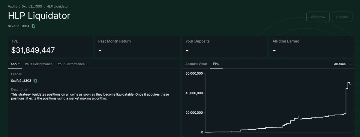 12/ And typically the vault tends to be quite profitable over time because it has the chance to buy at deep discounts and sell at high spikes. For example the Hyperliquid vault made about $40 million in an hour tonight.