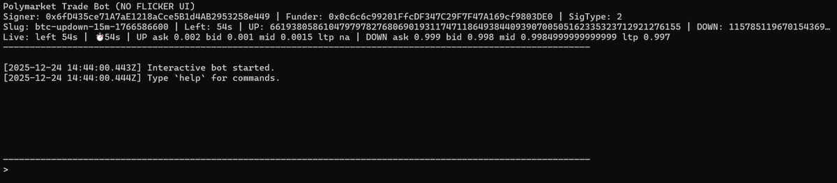 The bot runs a live watcher that automatically switches to the current BTC 15-minute round, streams best bid/ask prices via WebSocket, displays a fixed terminal UI, and allows full control through text commands.