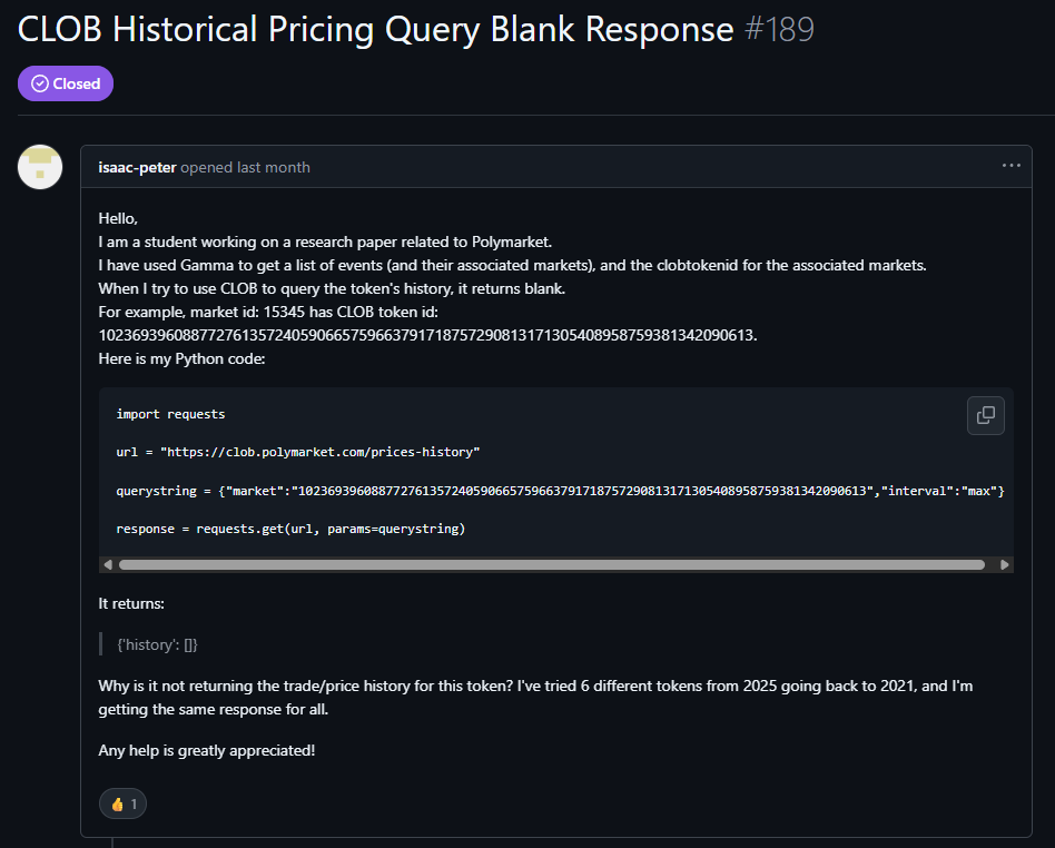 My second idea was to backtest using online historical data from Polymarket’s CLOB API. Unfortunately, for the BTC 15-minute UP/DOWN markets, the historical endpoints kept returning empty datasets. Without historical price ticks, the backtest can’t detect a “dump over ~3 seconds,” can’t trigger Leg 1, and produces 0 cycles and 0% ROI, regardless of the parameters.