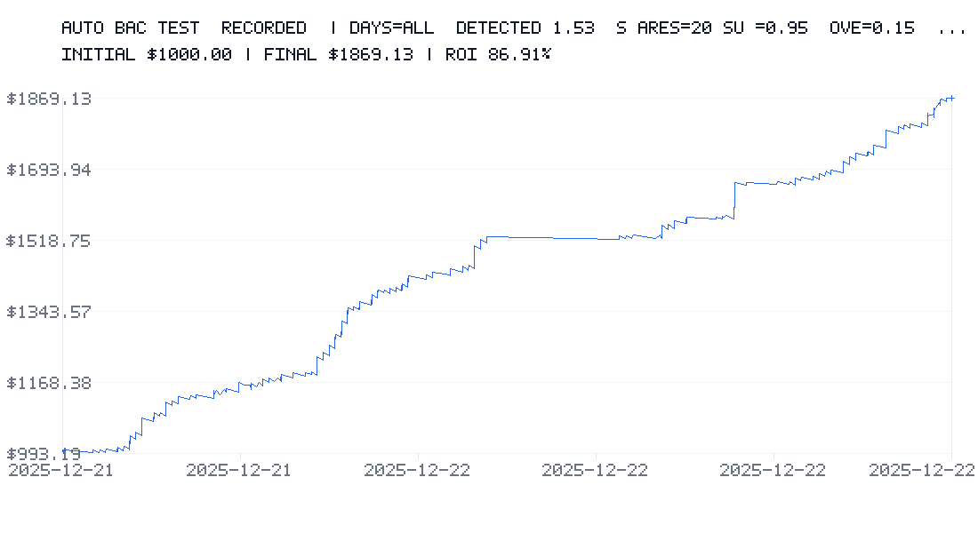 The backtest shows an ROI of 86%, with $1,000 turning into $1,869 in just a few days.