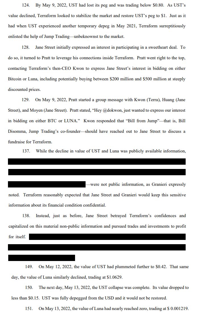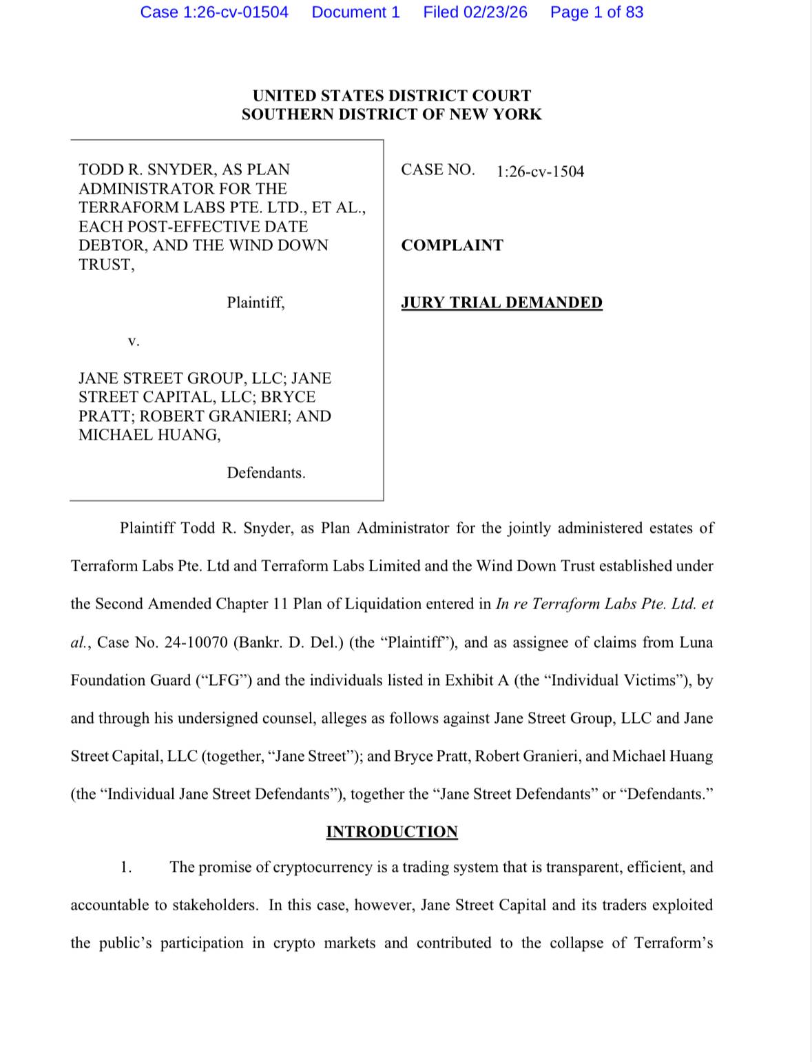 According to the complaint (filed in Manhattan federal court, Case No. 1:26-cv-1504), Jane Street obtained confidential details about Terraform's emergency moves through insider connections – including employees like Bryce Pratt and Michael Huang, plus co-founder Robert Granieri named in the suit.