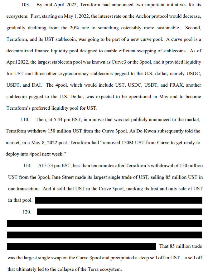 Minutes later (less than 10 minutes): A wallet linked to Jane Street allegedly executed the largest single UST sale in that pool's history – dumping 85 million UST. The suit claims this massive sell-off, done with advance knowledge of the liquidity removal, was the catalyst that pushed UST below $1 and ignited the death spiral.