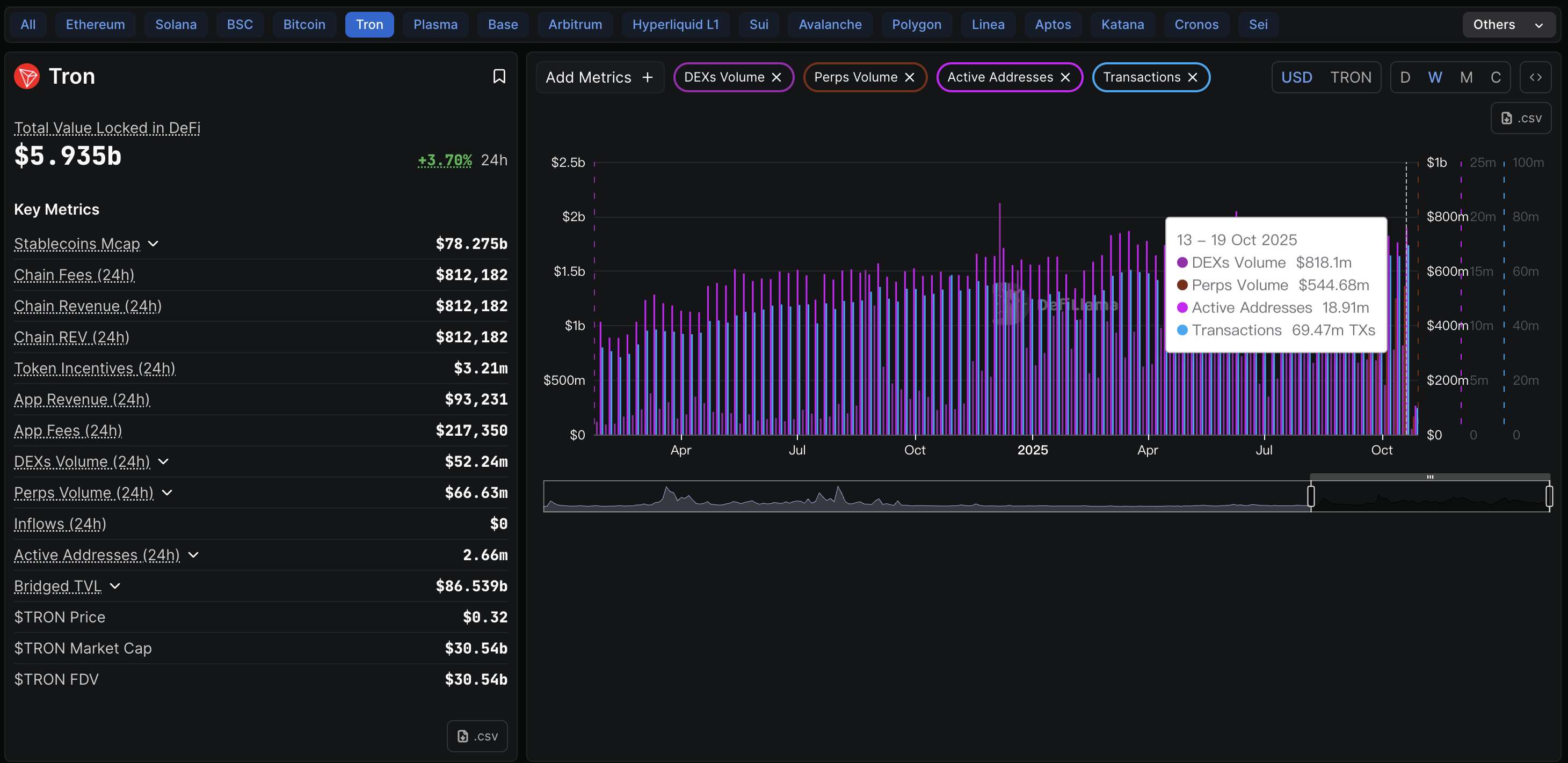 Despite the market downturn last week, #Tron saw strong growth across DEX & Perps volume, active addresses, and transactions.