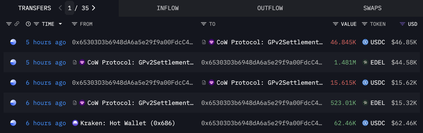 0x6530 withdrew 62,460 $USDC from #Kraken to buy 2M $EDEL 6 hours ago.