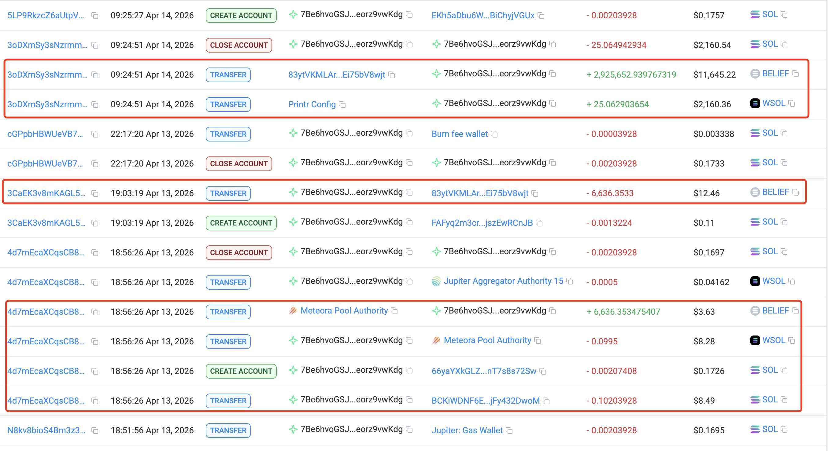 Trader 7Be6hv spent 0.1 $SOL($8.5) to buy 6,636 $BELIEF and staked it, earning 25.06 $SOL($2,160) and 2.9M $BELIEF($7,768 now) in staking rewards.