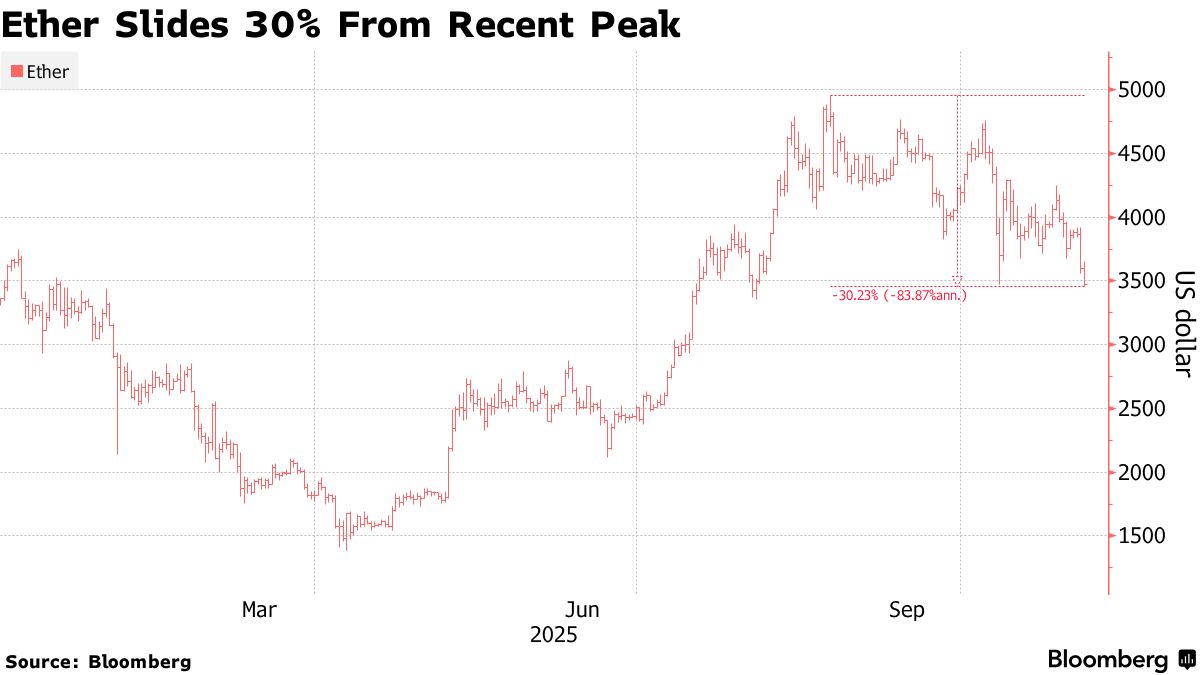 The world’s second-largest cryptocurrency dropped below $3,400 on Tuesday, sliding in tandem with market bellwether Bitcoin and tech stocks as Wall Street’s AI-fueled exuberance fades. The move has pushed Ether 30% below its August peak, returning prices to levels last seen before a wave of corporate buying and holding, further cementing the token’s entry into a bear market.