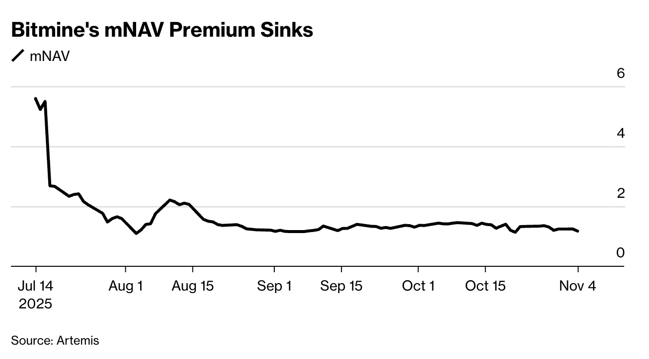 Bitmine’s market-cap-to-net-asset-value multiple has plunged from 5.6 in July to 1.2, according to data from Artemis, while its stock has dropped 70% from its peak. Like Bitcoin-linked companies before it, Bitmine’s equity now trades closer to its underlying holdings, as the market re-rates the once-lofty multiples attached to balance-sheet crypto.