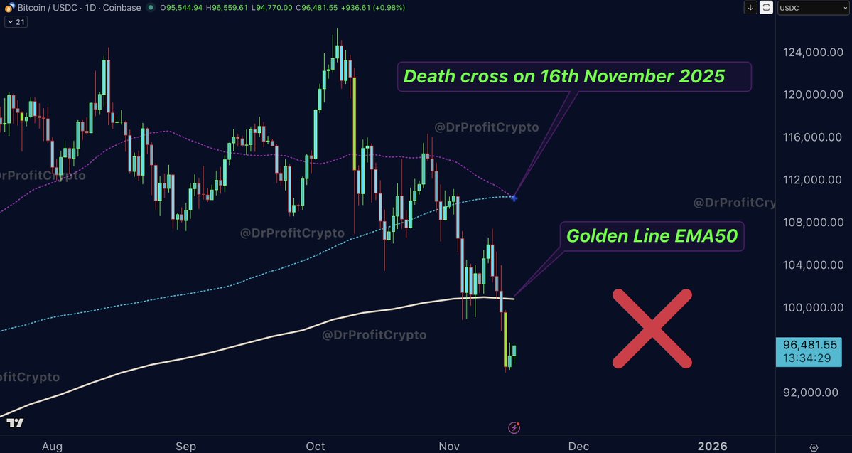 This time, the situation is entirely different, and people are completely ignoring it. Today’s death cross occurred while Bitcoin was trading 6% below the EMA50. This is a very important point that is being overlooked as we speak.