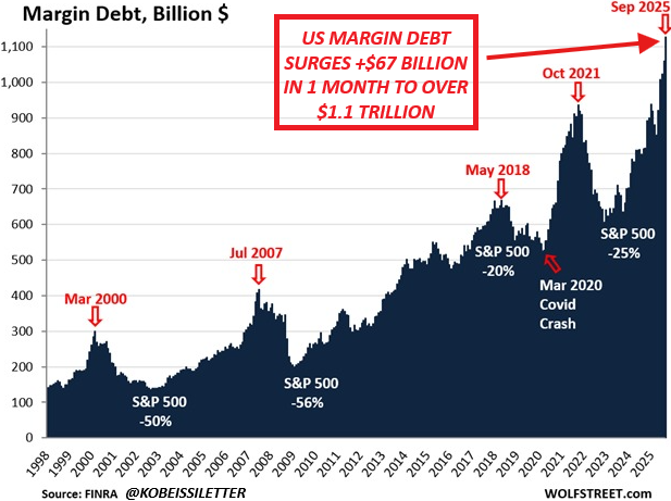 In September 2025, US investors took on another +$67 billion in margin debt bringing the total to a record $1.13 trillion.