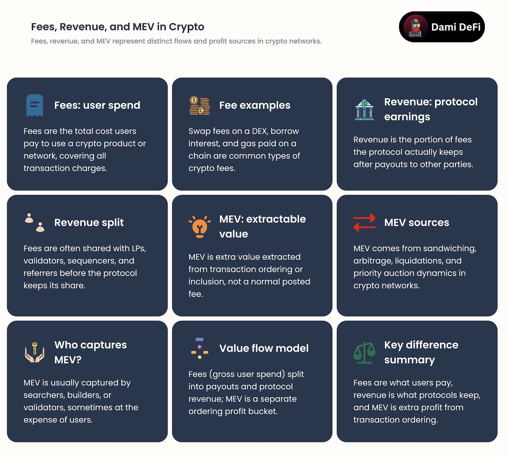 Let's get the basics straight. Fees are what users pay to transact. Revenue is what the protocol or validators actually keep. MEV (Maximal Extractable Value) is the extra profit validators earn by strategically ordering transactions.