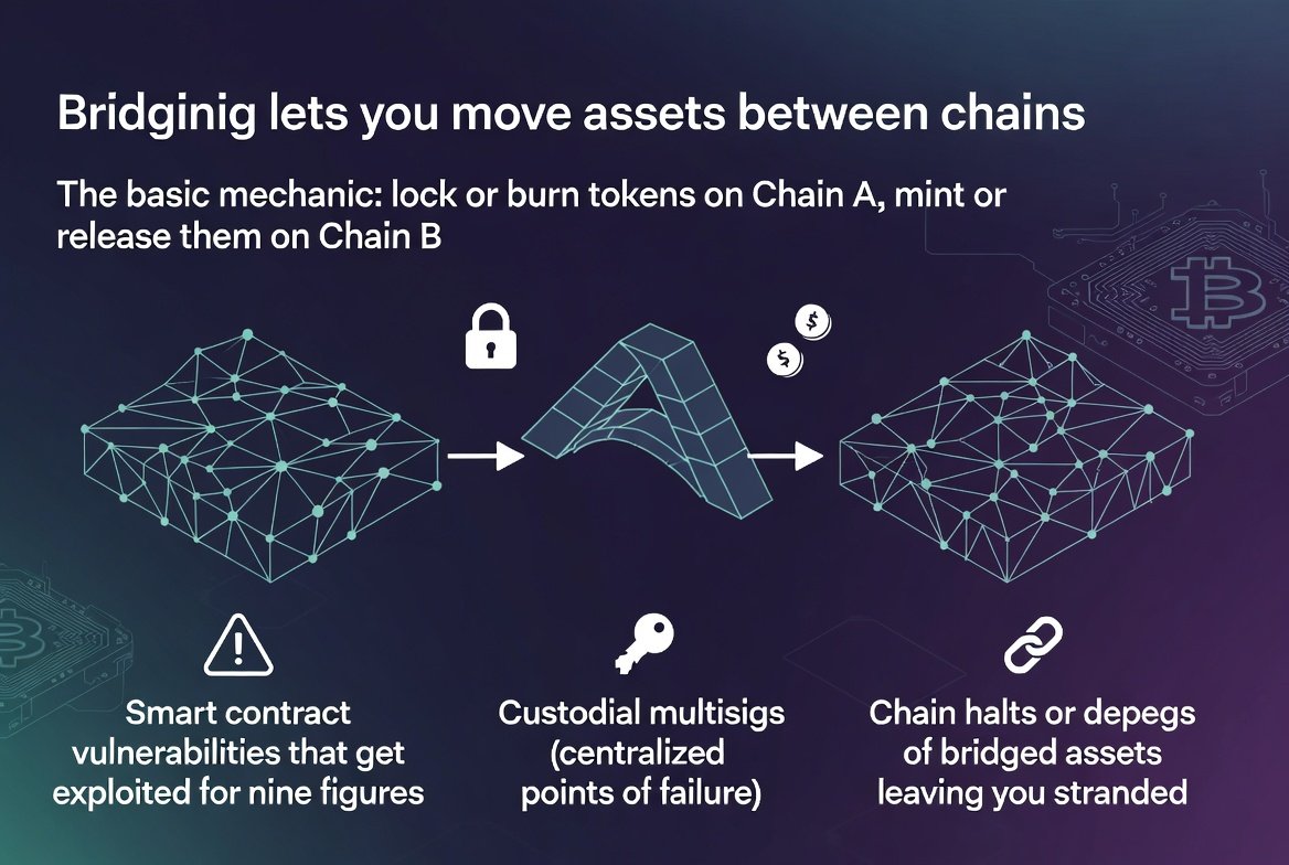 Bridging lets you move assets between chains. The basic mechanic: lock or burn tokens on Chain A, mint or release them on Chain B. Simple concept, complex risks.
