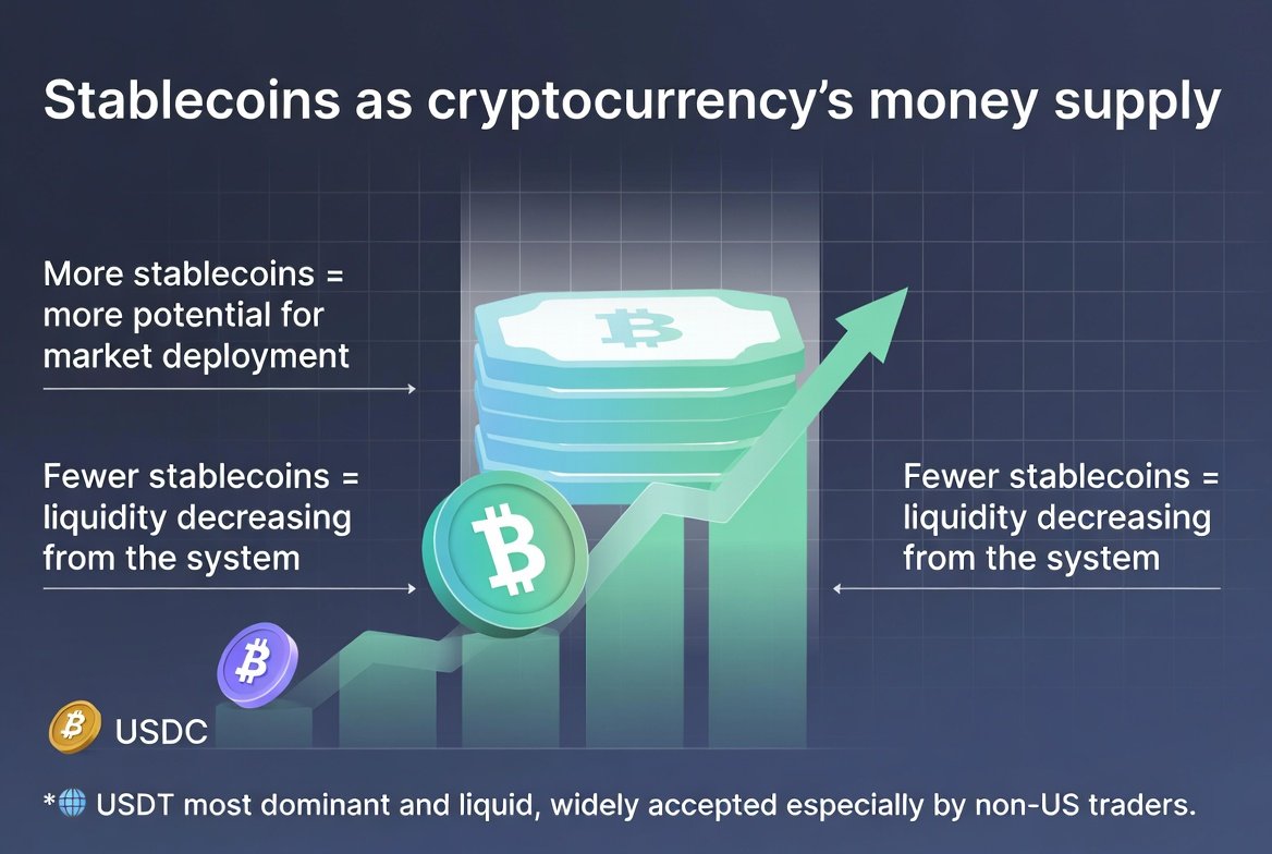 Stablecoin supply is basically crypto's money supply. More stablecoins mean more dry powder waiting to deploy. Less means liquidity is leaving the system.
