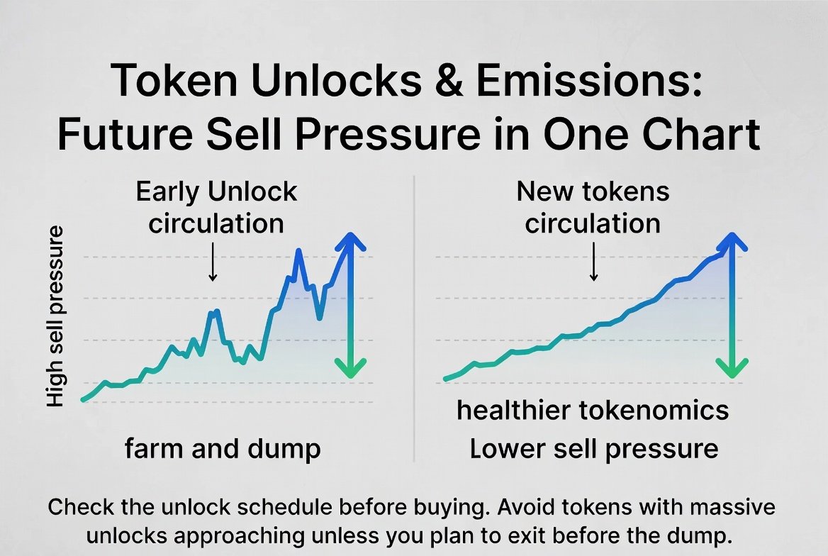 Unlocks and emissions represent new tokens entering circulation. Big unlocks mean automatic sellers: teams cashing out, VCs dumping, or reward programs flooding supply.