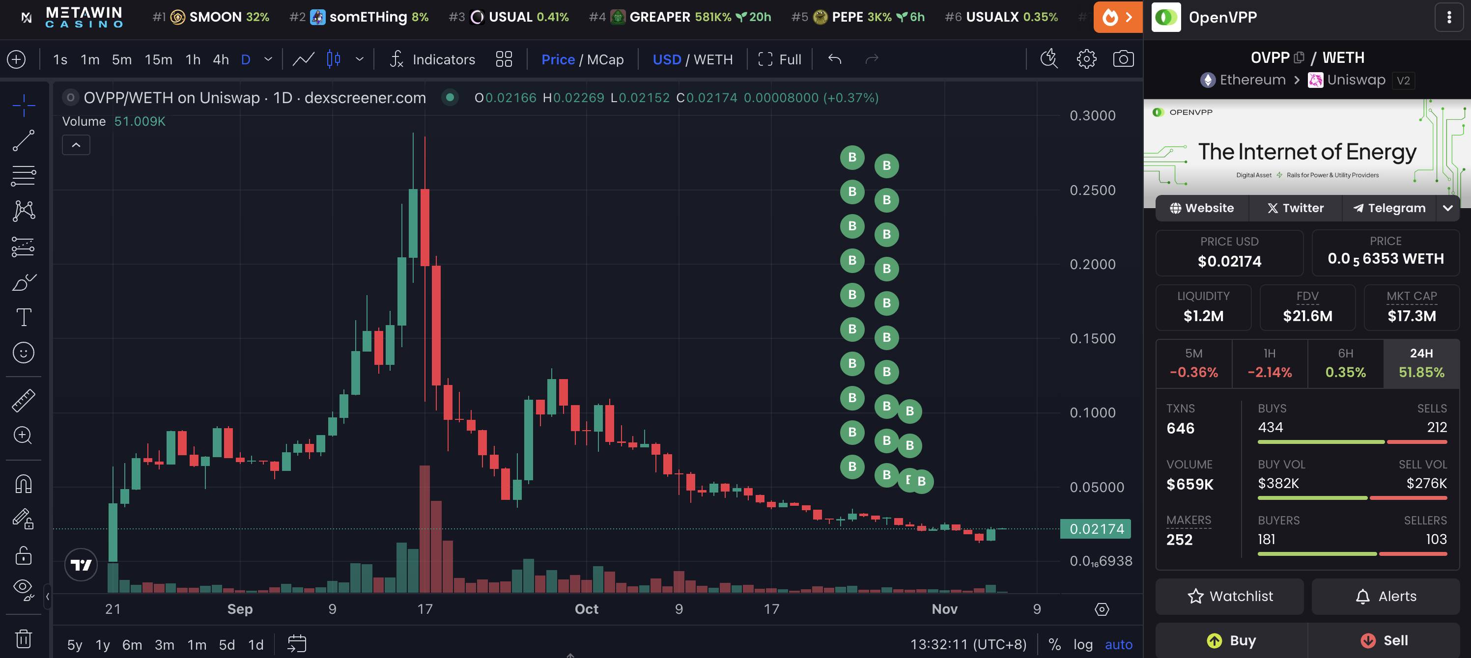 Over the past month, three whales have bought a total of 17M $OVPP($375K).