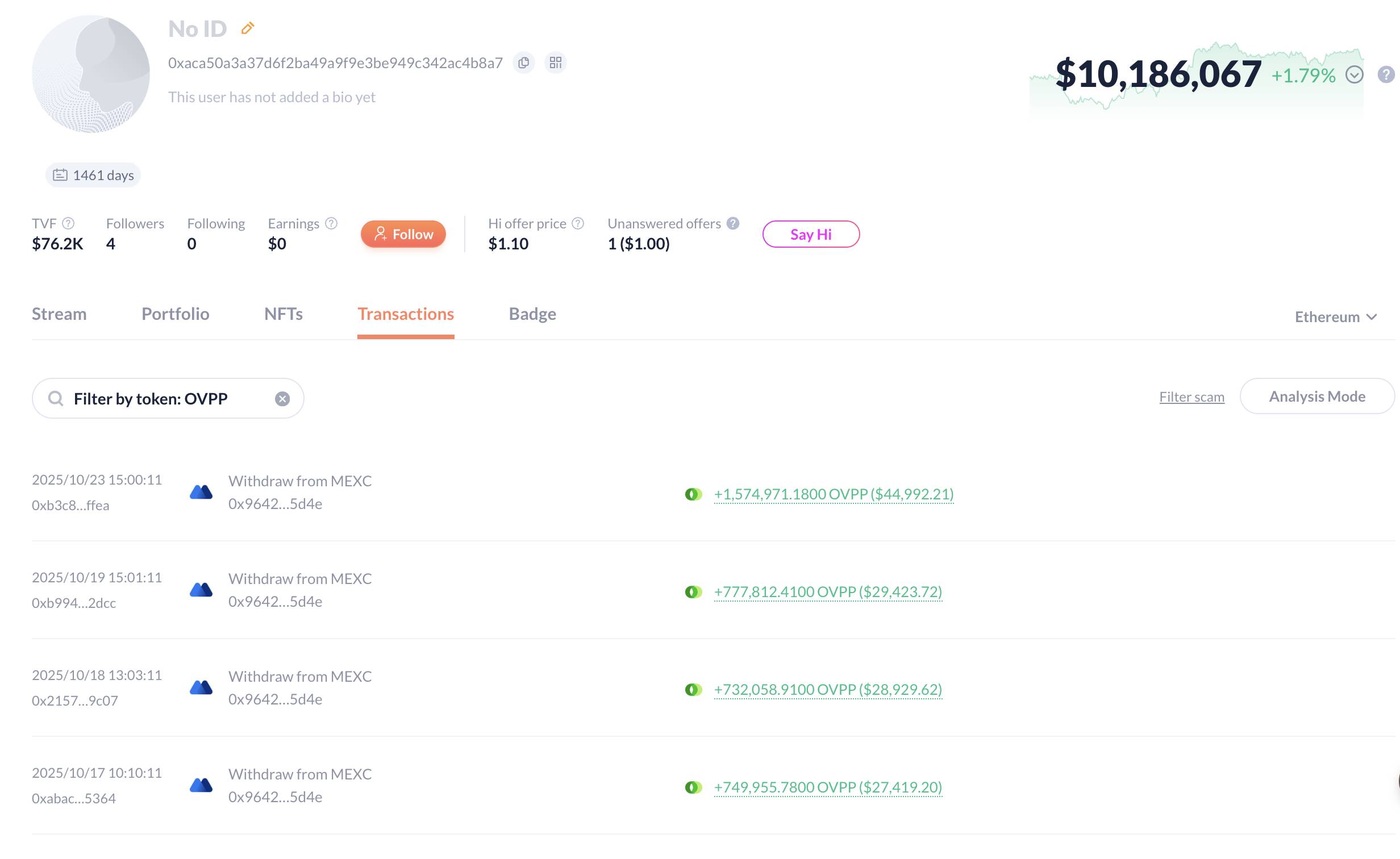 Whale 0xaca5, holding over $10M in assets, bought 7.6M $OVPP($165K) from MEXC and DEXs.