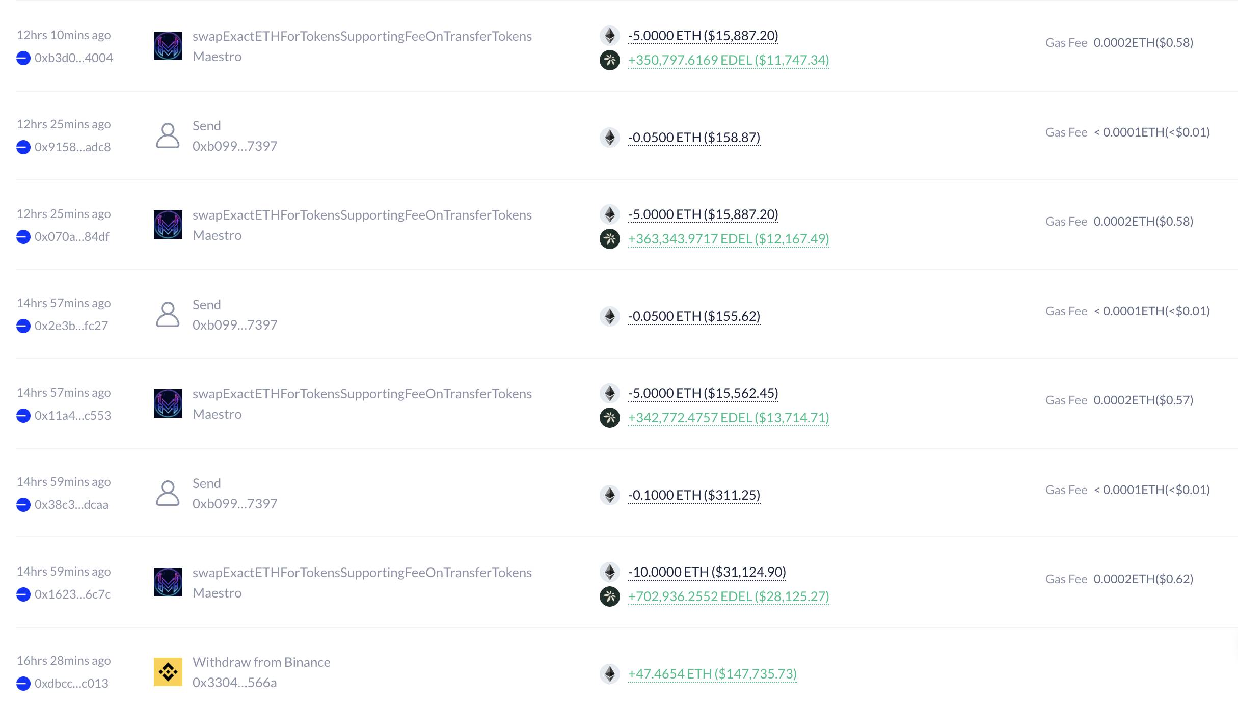 A newly created wallet 0x0d4e just withdrew 47.46 $ETH($148K) from #Binance and bought 2.09M $EDEL($70K) today.