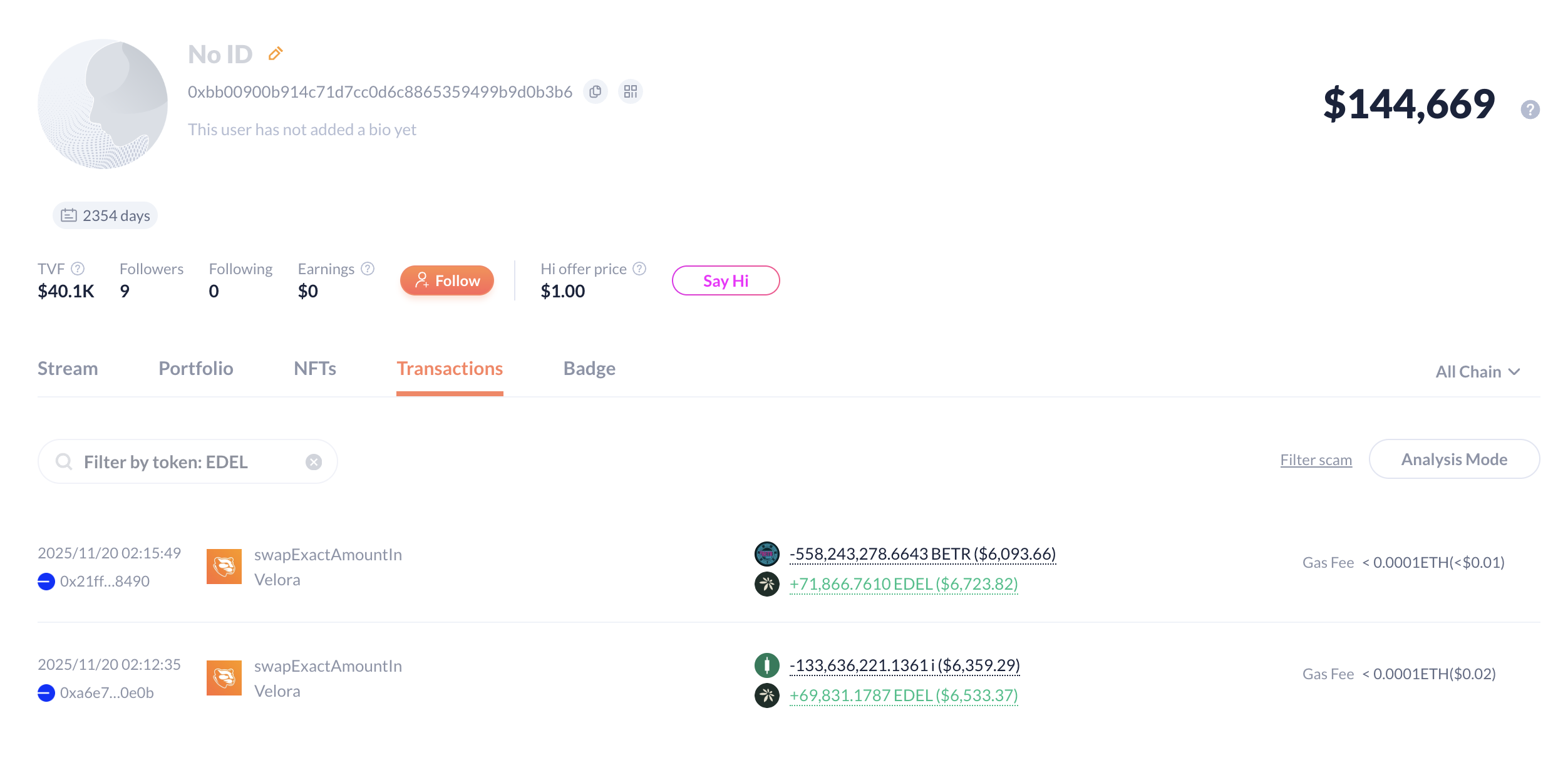 A smart trader 0xbb00, who's profited $902.69K, rotated part of his holdings into $EDEL.
