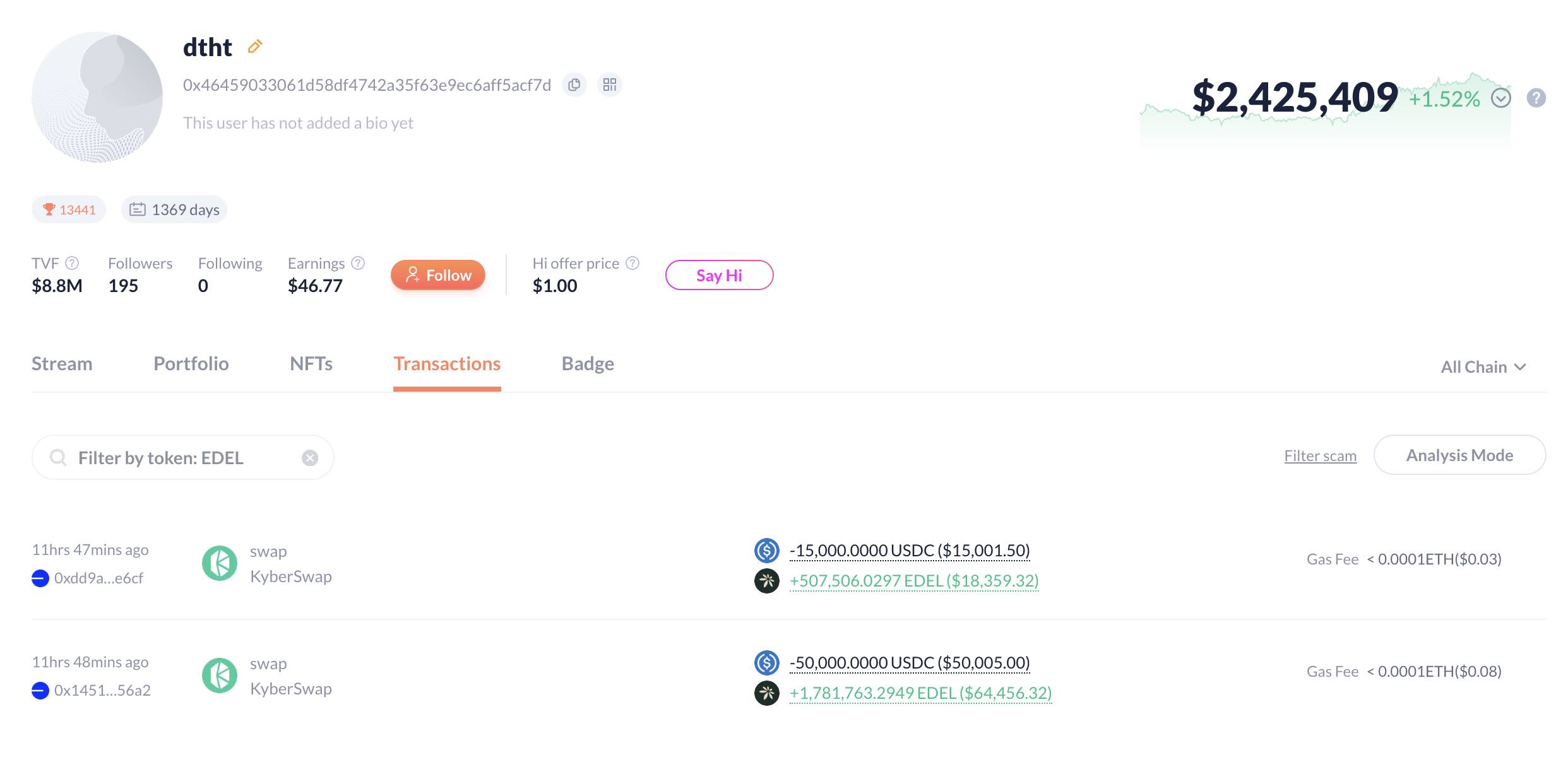Whale dtht, with $2.4M in assets, spent 65,000 $USDC to buy 2.29M $EDEL 11 hours ago.