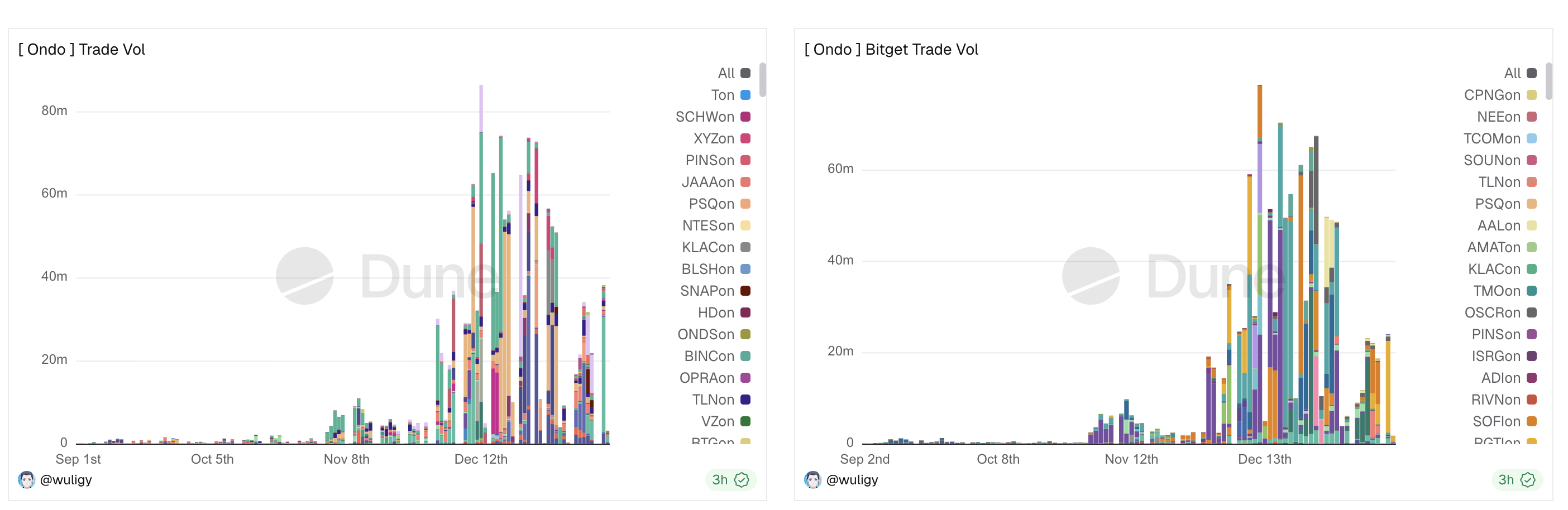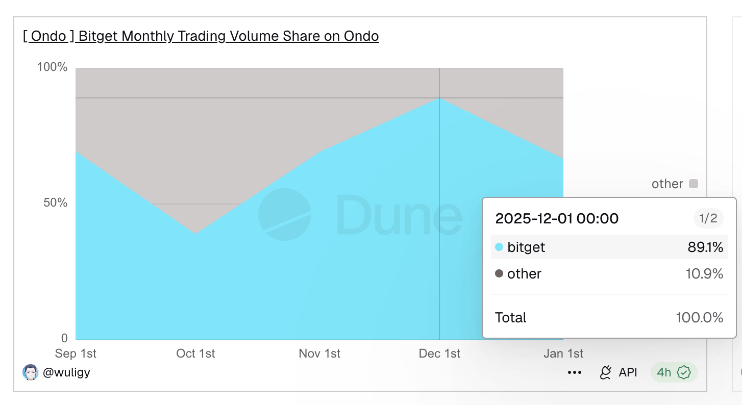Bitget (@bitget)'s cumulative trading volume for tokenized stocks has approached $1 billion, with its trading volume in December 2025 accounting for 89.1% of Ondo’s global market.