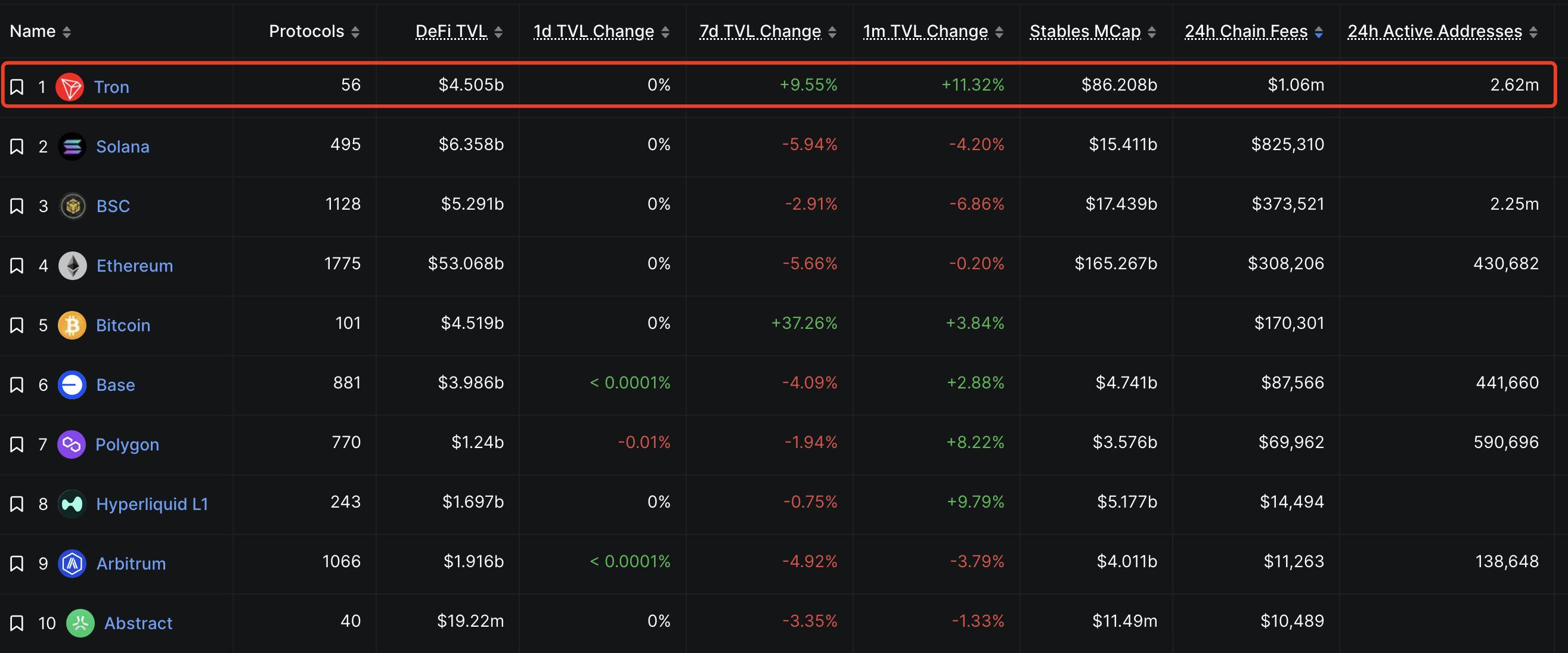 Tron's TVL is up 11.32% over the past month, leading all chains with 2.62M active addresses (24h) and $1.06M in 24h fees.