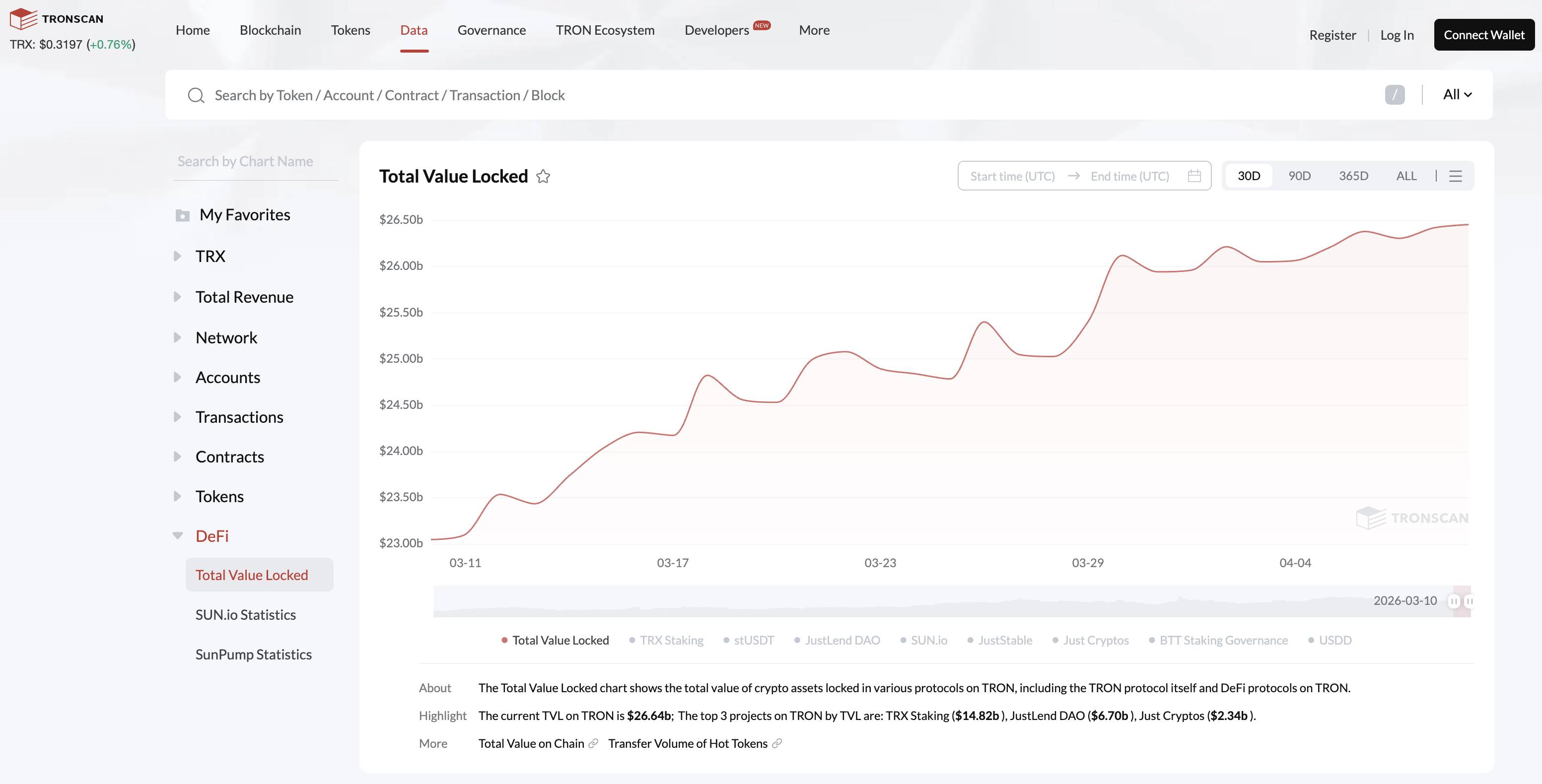 TVL on #Tron has been growing over the past month and has now reached $26.64B, with a 30-day increase of 15.6%.