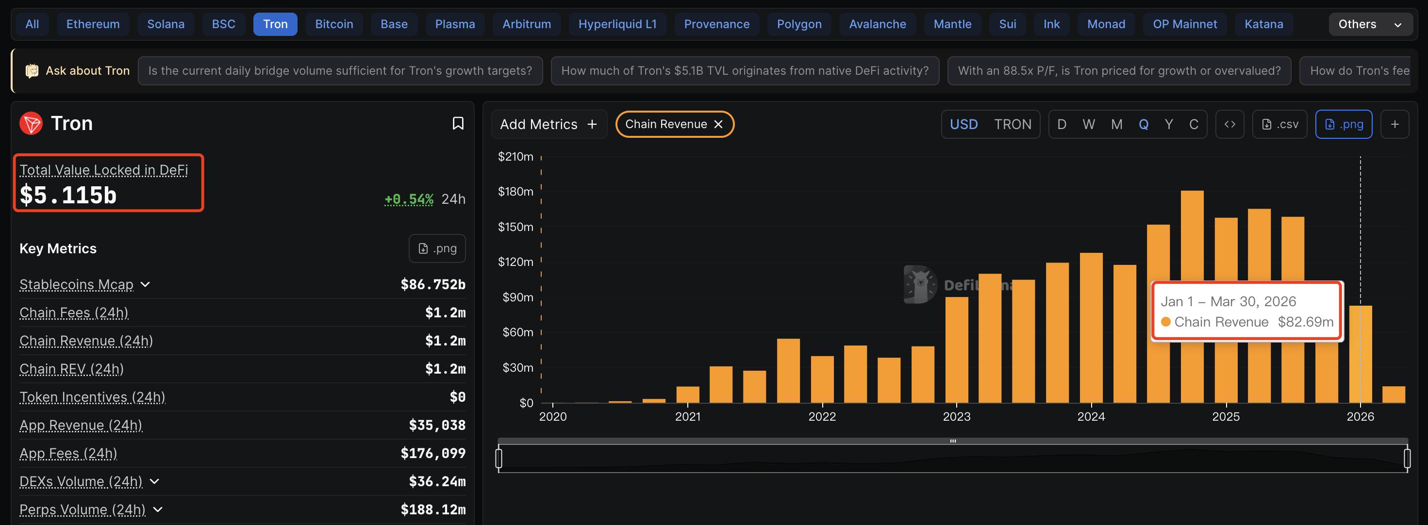 TRON's protocol revenue reached $82.69M in Q1 2026, second only to Hyperliquid among all chains. At the same time, TRON's TVL reached $5.115B.