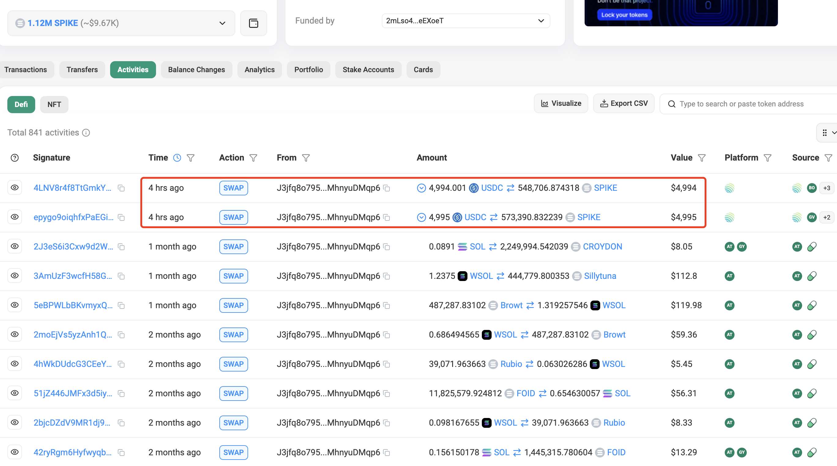 Smart trader J3jfq8, who previously made over $3.8M(3,500x+ return) on $MOODENG, spent 10,000 $USDC to buy 1.12M $SPIKE 4 hours ago.