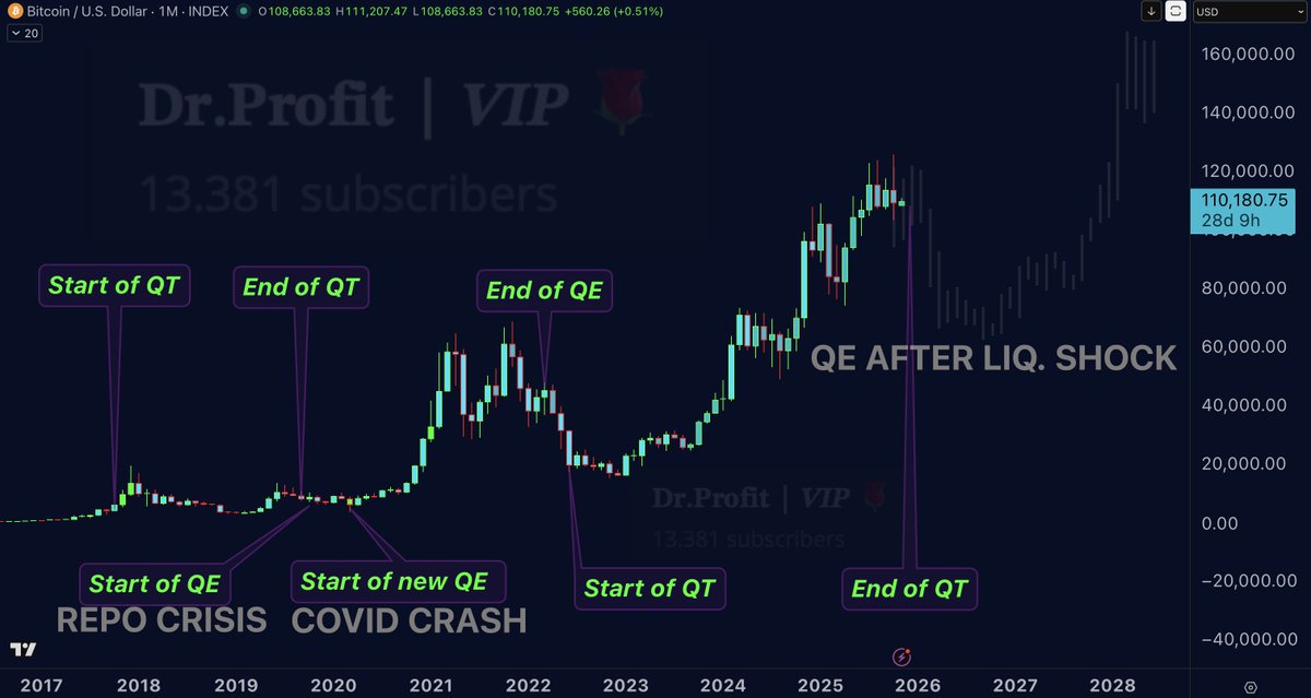 There is a lot of misunderstanding and wrong information circulating about the current market situation. First of all, the end of Quantitative Tightening (QT) is not the start of Quantitative Easing (QE). These are two completely different stages in the monetary cycle. QT means the Federal Reserve is reducing liquidity by letting bonds mature without reinvesting, means in other words, the FED collects back its dollars to pressure down inflation, while QE means the Fed is expanding its balance sheet and injecting new liquidity through asset purchases, which in other words mean money printing. Jerome Powell did not announce QE. He announced that QT will officially end on December 1, 2025. Unlike many analysts that claim that QT ended on the date of the FOMC meeting, its one more big misunderstanding! On the FOMC date, it was announced that QT is going to end on 1st of December, not that it already ended, thats a big difference! Until then, the Fed continues to reduce liquidity in the system. Historically, the Fed only begins QE after a liquidity crisis develops, such as in 2008, the 2019 repo crisis, or the 2020 Covid crash. That pattern has never changed, and there is no evidence that it will be different this time.