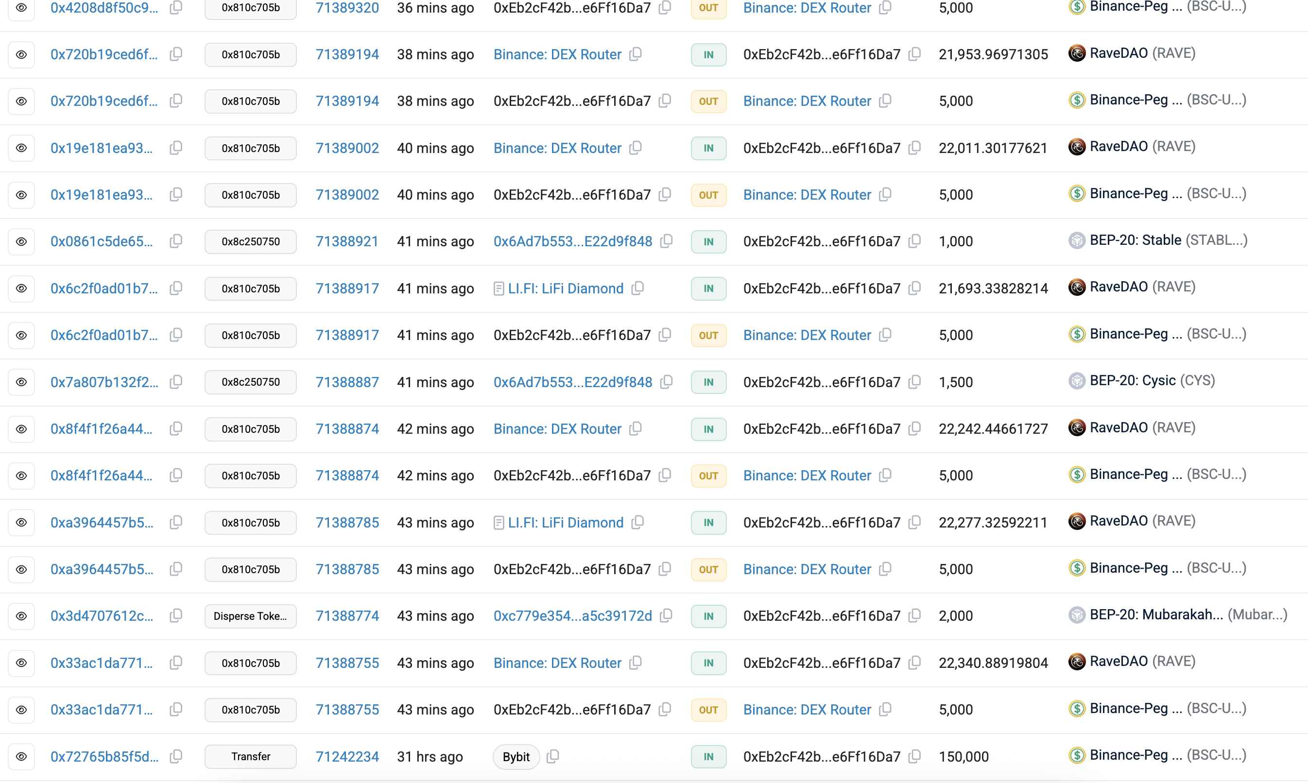 Two newly created wallets (0x98DF and 0xEb2c) just withdrew 300,000 $USDT from #Bybit to buy $RAVE.