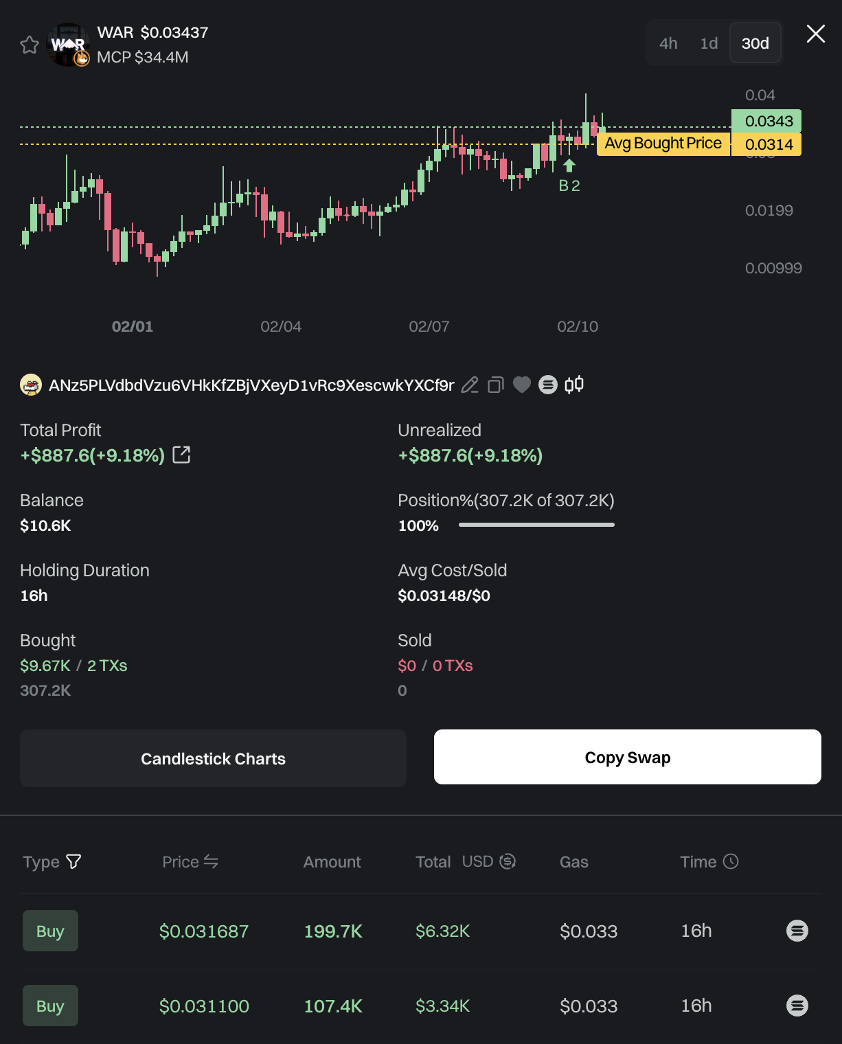 Smart trader ANz5PL, who made $4.2M on $TRUMP, came back after 8 months of inactivity and spent 112 $SOL($9.7K) to buy 307,159 $WAR today.