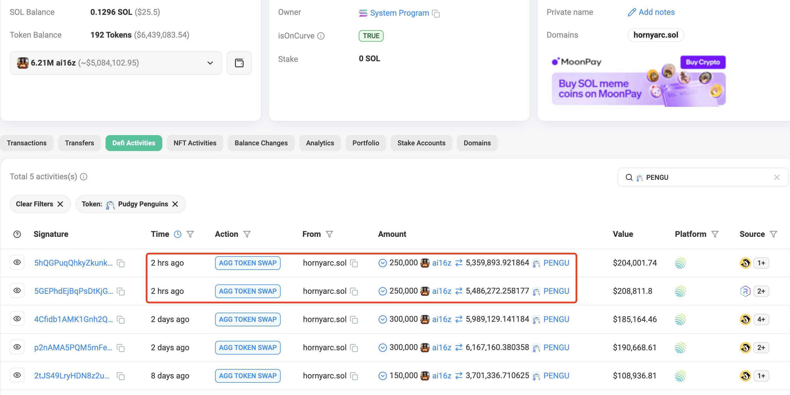 A whale who made $9.5M on ai16z exchanged 500K ai16z($412K) for PENGU again 2 hours ago.